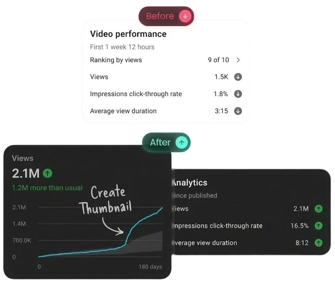 حسّن نسبة النقر CTR، واجذب المزيد من المشاهدين، وزد مشاهدات فيديوهاتك بدون خبرة في التصميم.